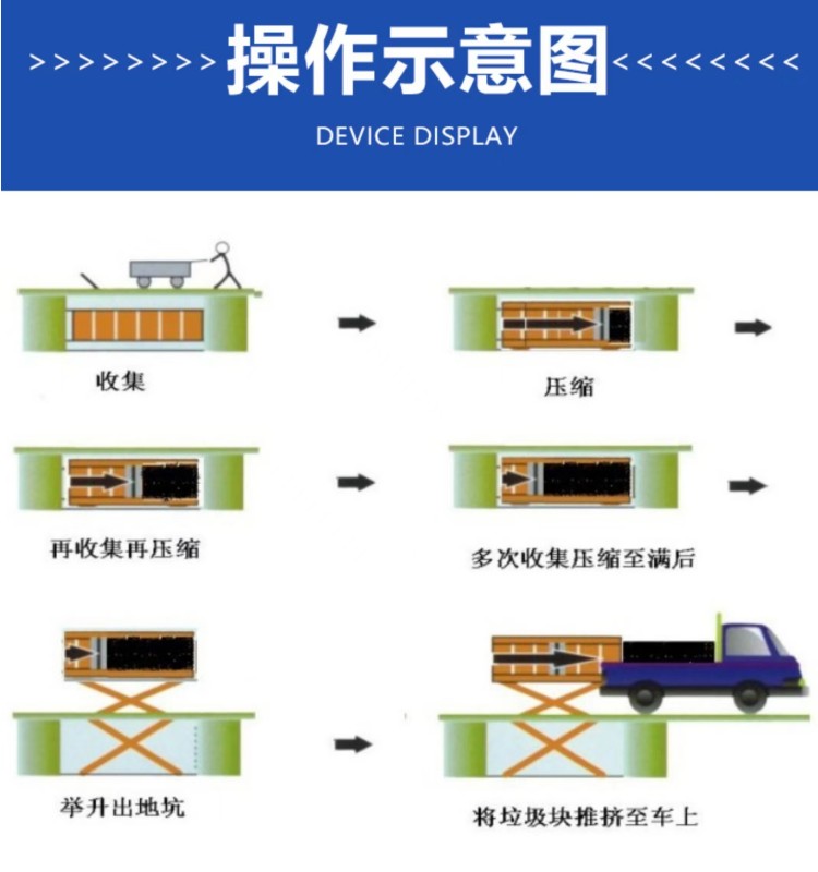 ◇平穩(wěn)可靠:兩側(cè)舉升,剪叉跨度大,升降平穩(wěn),無傾斜; ◇淺地坑:地坑深度僅為1.55m,保潔及維修極為方便; ◇高效率:壓實(shí)每噸垃圾時(shí)間≤10min; ◇全封閉水平壓縮:采用水平壓縮方式,垃圾壓縮密度≥0.86t/m3,垃圾壓縮后體積大大減小,從而大幅度提高轉(zhuǎn)運(yùn)車輛裝載量和轉(zhuǎn)運(yùn)效率,降低垃圾處理、轉(zhuǎn)運(yùn)等費(fèi)用; ◇動作少,故障率低,整套設(shè)備的垃圾壓縮、裝車由三個(gè)動作完成,簡單實(shí)用,各動作之間安全互鎖,防止操作人員誤操作造成安全事故,安全可靠; ◇垃圾儲存、壓縮及寄存全部在地面以下,地面上沒有垃圾散落,對環(huán)境影響較小,環(huán)保性好;垃圾壓縮后密度高,水份少,可避免汽車運(yùn)輸中的垃圾散落、污水滴漏現(xiàn)象,避免二次污染; ◇土建費(fèi)用低,占地面積小,可以不蓋大型工作間,既節(jié)約了投資,也縮短了工期; ◇留有專門的維修窗口,維修保養(yǎng)方便; ◇設(shè)有固定式操作和遙控器兩種操作模式,方便實(shí)用; ◇自動化程度高,可大幅提高工作效率,降低勞動強(qiáng)度。